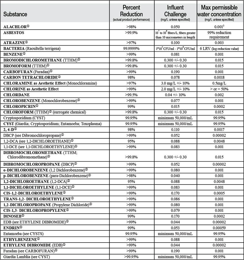 Note: All tests completed in accordance with NSF/ANSI standards 42, 53 & P-231 for reduction of the substances listed