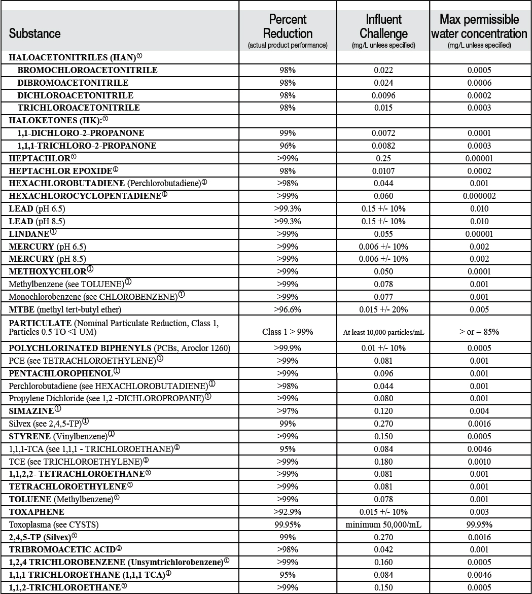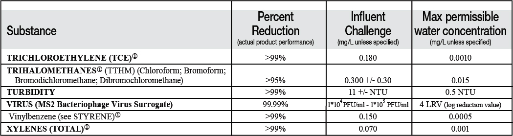 * Percent reduction reflects the allowable claims for Volatile Organic Chemicals/Compounds as per NSF/ANSI 53 Standard, Section 7.2.4.1.